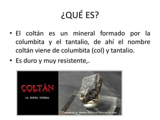 El coltán es un mineral formado por columbita y tantalio que se encuentra principalmente en la República Democrática del Congo. Es de color gris metálico, muy duro y resistente, y se usa para fabricar dispositivos electrónicos como teléfonos móviles, ordenadores y videojuegos. Su extracción causa muchas muertes en el Congo debido a que es un material escaso y valioso.