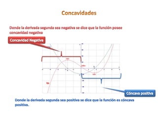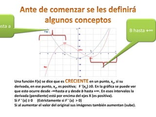 Una función es creciente en un punto si su derivada es positiva en ese punto, y es decreciente si su derivada es negativa. Una función tiene un máximo relativo si su derivada se anula y cambia de positiva a negativa, y tiene un mínimo relativo si su derivada se anula y cambia de negativa a positiva. Un punto de inflexión es donde la segunda derivada tiene un máximo o mínimo.