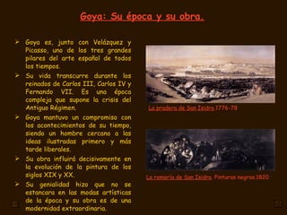 Goya vivió durante los reinados de Carlos III, Carlos IV y Fernando VII en España, una época de cambios políticos y crisis del Antiguo Régimen. Fue un pintor innovador que influyó en el arte de los siglos posteriores, conocido por sus retratos realistas, escenas costumbristas, y poderosas representaciones de la guerra y el sufrimiento humano. A lo largo de su carrera, Goya mantuvo un compromiso con los acontecimientos de su época y plasmó sus ideas ilustradas y liberales a través de su pint