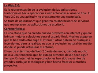 El documento habla sobre la Web 2.0 y las Tecnologías de la Información y Comunicación (TICs) en la educación. Explica que la Web 2.0 permite la colaboración y servicios en línea en lugar de aplicaciones de escritorio, y que las TICs han transformado la forma en que las personas se comunican e interactúan, por lo que es importante integrarlas en la educación. Finalmente, enfatiza la importancia de capacitar a los docentes sobre el uso de la tecnología en la enseñanza para motivar a los estudiantes.
