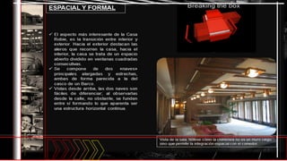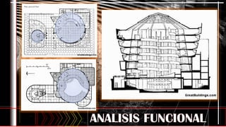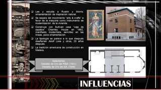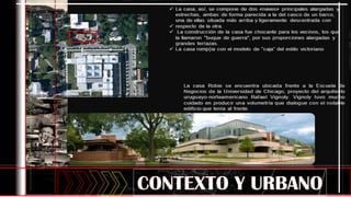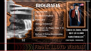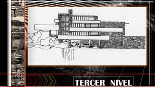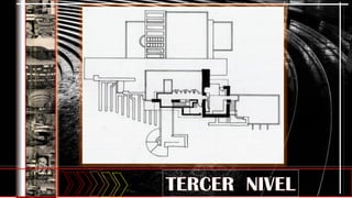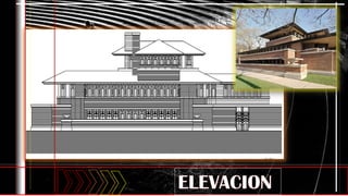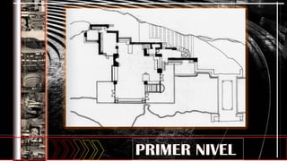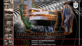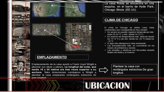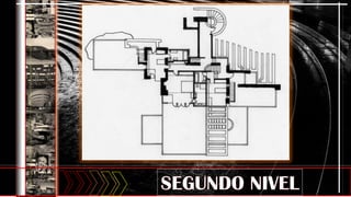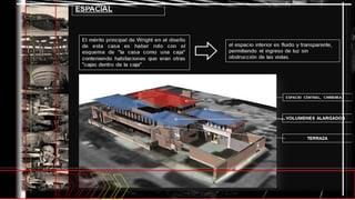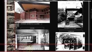 Este documento presenta información sobre varios proyectos del arquitecto Frank Lloyd Wright, incluyendo la Casa Robie en Chicago, el Museo Guggenheim en Nueva York y Taliesin en Wisconsin. Describe características clave de sus diseños como el uso de plantas libres, la integración con la naturaleza, y crear espacios que fluyen. También resume brevemente la vida y carrera de Wright, reconociendo su influencia en la arquitectura moderna.