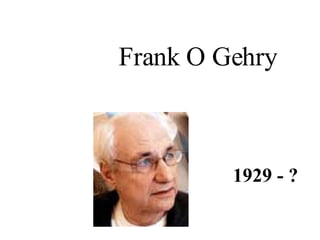 Frank Gehry es un arquitecto canadiense-estadounidense nacido en 1929 conocido por sus obras originales y atrevidas como la fachada de la agencia Chiat/Day/Mojo en 1964, su casa propia entre 1979-1987, el Auditorio para la Filarmónica de Los Angeles en 1991, el Centro Fisher de Nueva York, el Edificio de Oficinas de Düsseldorf en 2001 y su obra más famosa, el Museo Guggenheim de Bilbao de 1997.