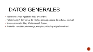 Mary Wollstonecraft Godwin nació en Londres en 1797 y falleció en 1851. Fue una escritora británica conocida principalmente por su novela Frankenstein o el Moderno Prometeo, publicada de forma anónima en 1818, en la que explora temas como la responsabilidad del científico y las consecuencias de la ambición humana.