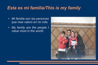 El documento describe la rutina diaria de una persona, incluyendo despertarse a las 8 am de lunes a viernes para ir a la escuela, almorzar en casa con su familia después de salir de la escuela a las 2 pm, y tener fines de semana libres aunque a veces tenga que estudiar. También presenta a su familia y perro llamado Yaki de 1 año como personas y cosas valiosas en su vida.