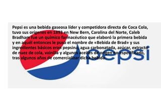 Pepsi es una de las principales marcas de bebidas gaseosas en competencia con Coca Cola. Se originó en 1893 y actualmente ofrece una amplia gama de productos como refrescos, té, energéticos y agua, además de frituras y alimentos Quaker. Pepsi distribuye sus productos a través de grandes supermercados, gasolineras y restaurantes para maximizar la exposición al mercado.