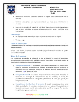 Una franquicia es un acuerdo comercial entre un franquiciante, que posee una marca exitosa, y un franquiciado que desea invertir y usar la marca y fórmula del negocio a cambio de un pago. Las franquicias ofrecen ventajas como minimizar riesgos y trabajar con una marca conocida, pero el franquiciado no posee el control total del negocio. Antes de invertir en una franquicia, el emprendedor debe definir sus expectativas, elegir una franquicia acorde a sus intereses, y