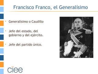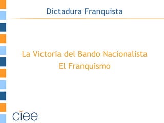Este documento describe la dictadura franquista en España desde la victoria del bando nacionalista en la Guerra Civil hasta la transición a la democracia. Se divide en dos periodos: el primer franquismo de 1940-1950 caracterizado por una dictadura militar y aislamiento, y el segundo franquismo de 1960-1970 con un estado más tecnócrata, apertura económica y cambios sociales. El documento también analiza aspectos políticos, económicos e internacionales durante estos periodos.