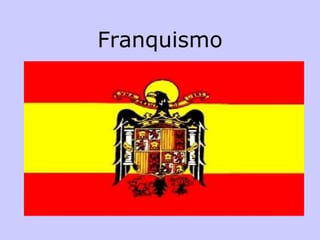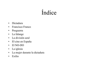 El documento resume aspectos clave de la dictadura franquista en España desde 1939 hasta 1975, incluyendo que Francisco Franco gobernó como dictador militar tras la guerra civil, la creación de grupos de extrema derecha como la Falange que perseguían a los republicanos, la censura del cine y prensa por el régimen, y el exilio y represión de muchos españoles de izquierdas.