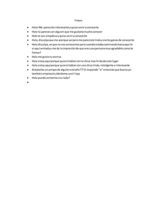 El documento contiene varias frases cortas de alguien intentando iniciar una conversación o coquetear con otra persona de manera no deseada o incómoda, incluyendo comentarios sobre su apariencia física y peticiones de conocerse a pesar de no conocerse previamente.