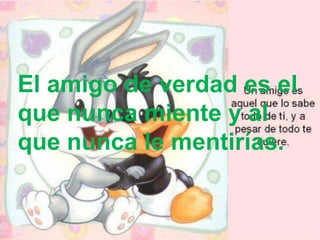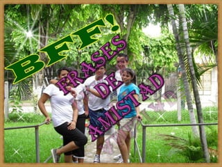 Este documento presenta varias frases sobre la amistad. Describe a un amigo verdadero como alguien que nunca miente y a quien nunca le mentirías. También señala que los animales son buenos amigos porque no hacen preguntas ni critican, y que un amigo verdadero acude a ayudarte sin que lo llames como la sangre acude a una herida. Finalmente, destaca que la verdadera amistad requiere tiempo para madurar y enfrentar las dificultades juntos antes de alcanzar su máxima fortaleza.