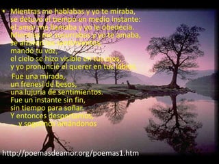 Los poemas describen el amor intenso entre dos personas, donde el tiempo se detiene y solo existen el uno para el otro. Se expresan sentimientos como la pasión, la necesidad del otro, la felicidad al estar juntos y la tristeza cuando están separados. A través de las palabras se transmite lo profundo del amor que sienten.