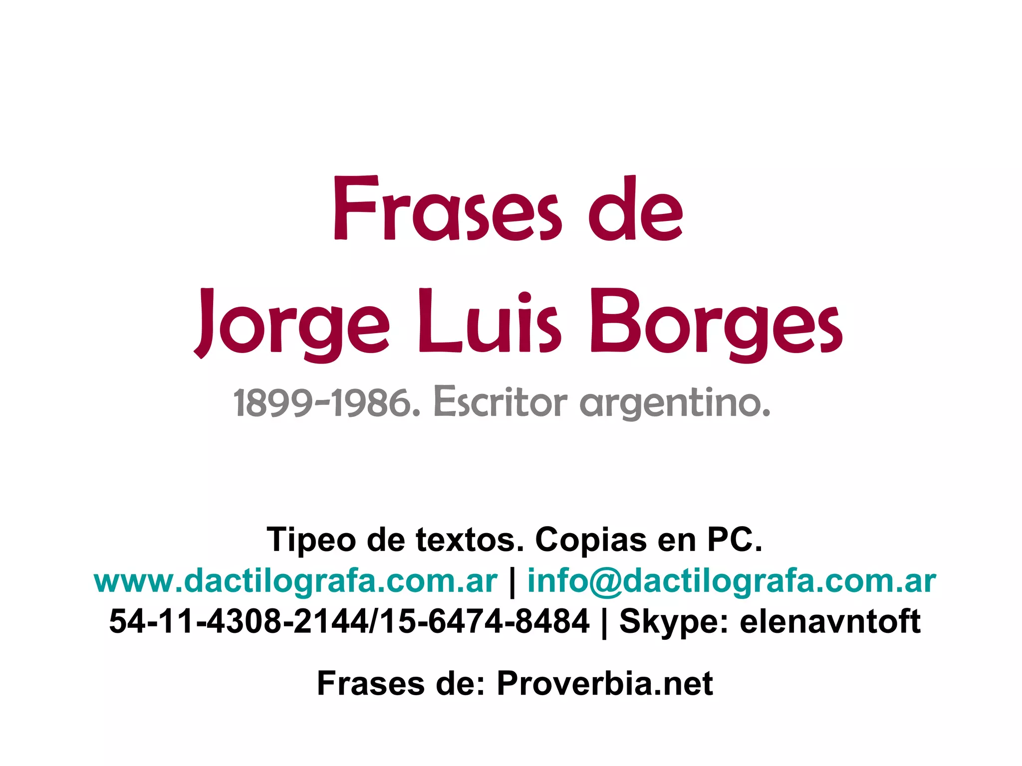 Este documento contiene una colección de citas del escritor argentino Jorge Luis Borges sobre temas como el olvido, las bibliotecas, la felicidad, las teorías, la memoria, la belleza, la inteligencia, el arte, las tiranías, Buenos Aires y los sueños.