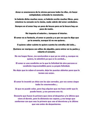 Este documento contiene una colección de frases sobre el amor. Expresan sentimientos como amar sin ser amado en respuesta, amar a pesar de los defectos del otro, comprender al ser amado, y desear la felicidad del otro. También describen al amor como una locura con razón, un sentimiento que hace sentir que se pueden lograr cosas imposibles, y algo que se extraña cuando no está presente.