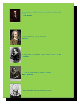 Este documento presenta una colección de citas y frases de filósofos de diferentes épocas y corrientes filosóficas, incluyendo filosofía medieval, clásica, moderna, contemporánea y latinoamericana. Cubre temas como la metafísica, la ética, la política, la realidad y el ser humano. También incluye definiciones breves de varios conceptos y corrientes filosóficas.