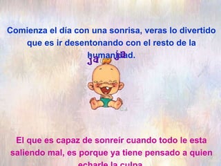 Este documento contiene una serie de frases ingeniosas y reflexivas. Algunas recomiendan mantener una actitud positiva ante la vida y no tomarse las cosas demasiado en serio. Otras ofrecen perspectivas irónicas sobre temas como la felicidad, el éxito, la salud y la individualidad. El documento invita al lector a disfrutar de la vida y aprovechar el tiempo del que se dispone.