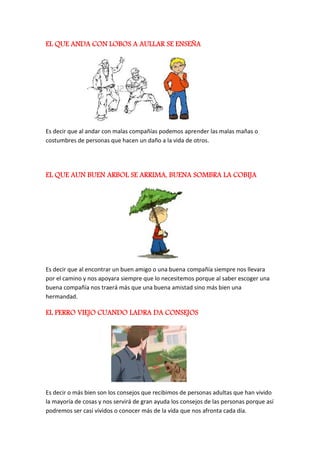 Este documento contiene 5 frases cortas que transmiten consejos y lecciones de vida. La primera frase destaca que los perros son los mejores amigos del hombre porque siempre estarán ahí para él. La segunda frase enfatiza la importancia de escuchar a otros, especialmente a las mujeres. La tercera frase advierte que pasar tiempo con personas de malas influencias puede llevar a aprender sus malos hábitos. La cuarta frase sugiere que estar cerca de buenos amigos ofrece protección y apoyo. Y la última frase indica que los consejos de las personas