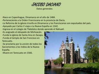 El documento resume la vida y obra de Jacobo Daciano, un fraile franciscano danés que viajó a Michoacán, México en 1542. Fundó varias iglesias y conventos y defendió los derechos de los indígenas a recibir los sacramentos. Se especula que podría haber sido hijo del rey Juan I de Dinamarca, aunque no hay pruebas concluyentes. Murió en 1566 en el convento de Tarecuato, Michoacán, donde vivió la mayor parte de su vida.