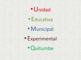 La Unidad Educativa Municipal Experimental Quitumbe tiene la visión de convertirse en una institución de élite para el 2018 que ofrezca una educación humanista y forme ciudadanos autogestionarios, proactivos, competentes y autodisciplinados que respeten el entorno natural y sean líderes sociales, políticos y culturales. Su misión es brindar un servicio educativo integral e incluyente de calidad a los estudiantes del Distrito Metropolitano de Quito mediante procesos pedagógicos y administrativos innovadores que permitan la participación de la