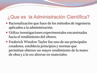 La administración científica de Frederick Taylor se basa en racionalizar los métodos de trabajo mediante análisis, estandarización y especialización para mejorar la productividad. Taylor descomponía cada tarea en movimientos simples y cronometraba los tiempos para establecer estándares de producción. Sus principios incluyen planeación científica del trabajo, selección y entrenamiento de trabajadores, e incentivos salariales basados en la productividad.