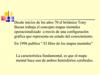 Este documento describe los mapas mentales, una herramienta educativa para organizar información de manera gráfica. Explica que los mapas mentales se originaron en los años 70 y que utilizan ambos hemisferios cerebrales. Detalla algunas características clave como tener una palabra o imagen central con ramas que irradian temas principales de forma ramificada. Finalmente, menciona algunos usos de los mapas mentales como obtener resúmenes, organizar conocimiento y mejorar la memoria.