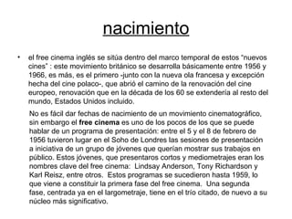 El documento describe el movimiento cinematográfico británico conocido como Free Cinema que se desarrolló entre 1956 y 1966. Los directores clave de este movimiento fueron Lindsay Anderson, Karel Reisz y Tony Richardson, quienes presentaron cortometrajes y mediometrajes en Londres en 1956 con el objetivo de renovar el cine británico de esa época. El Free Cinema se caracterizó por criticar el cine académico existente y promover películas con compromiso social que reflejen la vida cotidiana y los conflictos de la clase trabajadora