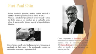 Frei Paul Otto fue un arquitecto y teórico alemán conocido por sus innovadoras estructuras tensadas de bajo peso. Algunas de sus obras más destacadas incluyen el Pabellón de Alemania Occidental para la Exposición Mundial de 1967 y la cubierta del Estadio Olímpico de Múnich de 1972. Otto se centró en el desarrollo de estructuras ligeras inspiradas en la naturaleza que minimizan el uso de materiales. Fue pionero en el uso de tensoestructuras, que combinan membranas