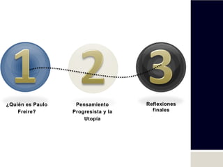 Paulo Freire (1921-1997) fue un educador y filósofo brasileño conocido por su método de alfabetización de adultos. Nació en Brasil y desarrolló un método exitoso de alfabetización que involucraba temas relevantes para la vida de los estudiantes. Fue exiliado después de un golpe militar en 1964 y pasó tiempo enseñando en Chile y otros países. Su libro Pedagogía del Oprimido tuvo una gran influencia en el pensamiento educativo y en la lucha por la justicia social.