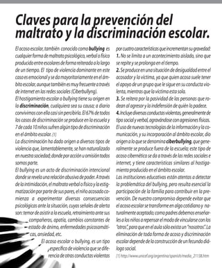 El documento trata sobre la importancia de prevenir el bullying y la discriminación en las escuelas. Señala que es responsabilidad de todos los miembros de la comunidad educativa, incluyendo padres, maestros e instituciones, trabajar en conjunto para crear un ambiente escolar inclusivo y libre de violencia donde todos los estudiantes se sientan seguros y respetados.