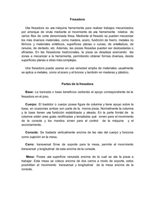 Una fresadora es una máquina herramienta que usa fresas rotativas para mecanizar superficies mediante el arranque de viruta. Tiene partes como la base, el cuerpo, la consola, el carro, la mesa y el puente. Puede usarse para hacer operaciones como corte, ranurado, fresado de cavidades, torno-fresado, fresado de roscas y engranajes. Existen diferentes tipos de fresas como frontales, de planear, en forma de T y bicónicas para diversas aplicaciones.
