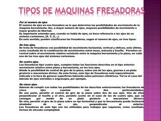 Las fresadoras pueden clasificarse según el número de ejes en tres, cuatro o cinco ejes. Las de tres ejes permiten movimiento en tres direcciones, mientras que las de cuatro y cinco ejes agregan la capacidad de girar la pieza. Las fresadoras también varían en su orientación, incluyendo fresadoras horizontales, universales, verticales y circulares.