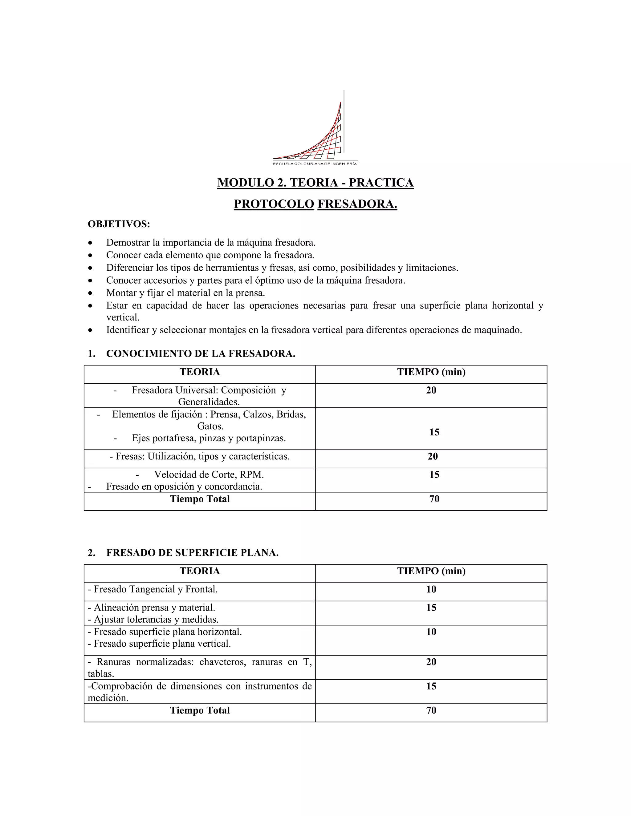 Este documento presenta los objetivos y contenidos de un módulo sobre teoría y práctica de fresadoras. El módulo explica los componentes y operaciones básicas de las fresadoras, incluyendo diferentes tipos de fresadoras, elementos de fijación, herramientas de corte, y cómo calcular la velocidad de corte y revoluciones por minuto. También cubre temas como dirección de fresado y diferentes operaciones que se pueden realizar con una fresadora vertical.