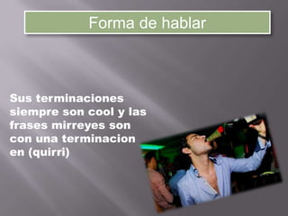 El documento describe las características de los "fresas", jóvenes de clase alta en México. Habla de su forma de hablar con terminaciones "cool" y frases "mirreyes", sus costumbres de ir a fiestas con amigos en lugar de sus padres y acompañarse siempre de mujeres, y su vestimenta cara de marca como camisas de botones y vestidos con tacones para asistir a fiestas.
