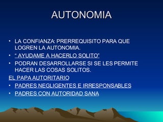 El documento habla sobre la autonomía en niños de 3-4 años. Explica que para desarrollar autonomía, los niños necesitan la confianza de los padres para hacer cosas por sí mismos. Padres autoritarios o negligentes no permiten el desarrollo de la autonomía, mientras que padres con límites sanos y tolerantes sí lo permiten. La vergüenza y la duda son parte inevitable del desarrollo en esta edad, siempre que los padres sean comprensivos y no se burlen de los esfuerzos del niño.