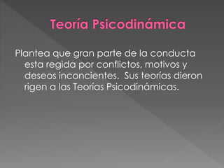 El documento resume las teorías de Sigmund Freud sobre el psicoanálisis. Freud propuso que gran parte de la conducta humana está regida por deseos e impulsos inconscientes. Desarrolló la teoría del aparato psíquico dividido en ello, yo y superyó, y las etapas psicosexuales de la infancia. Sus teorías dieron origen a las teorías psicodinámicas y revolucionaron la comprensión de la mente humana.
