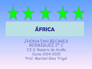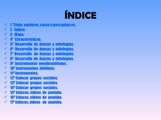 Este documento presenta un resumen de la música y la cultura de África. Incluye secciones sobre las características musicales de África, el desarrollo de danzas y mitologías, diferentes tipos de instrumentos musicales como membranófonos, idiófonos y aerófonos, grupos sociales africanos, y enlaces a videos de YouTube que muestran ejemplos musicales de África. El documento proporciona una visión general de la rica diversidad musical y cultural del continente africano.