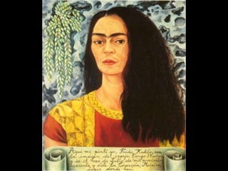 Frida Kahlo nació en México en 1907. Sufrió polio de niña y un accidente a los 18 años que la dejó con graves lesiones. Se casó con el muralista Diego Rivera en 1929. Tuvo una relación tormentosa con él marcada por infidelidades. Kahlo canalizó su dolor físico y emocional a través de sus autorretratos en un estilo surrealista. Murió en 1954 tras una vida de sufrimiento y más de 30 operaciones. Hoy es considerada una de las más importantes artistas mexicanas.
