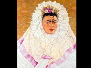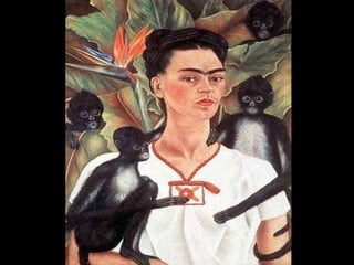Frida Kahlo nació en México en 1907. Sufrió polio de niña y un accidente a los 18 años que la dejó con graves lesiones. Se casó con el muralista Diego Rivera en 1929. Tuvo una relación tormentosa con él marcada por infidelidades. Canalizó su dolor físico y emocional en sus autorretratos en un estilo surrealista. Murió en 1954 tras una vida de sufrimiento y más de 30 operaciones. Hoy es considerada una de las más importantes artistas mexicanas.
