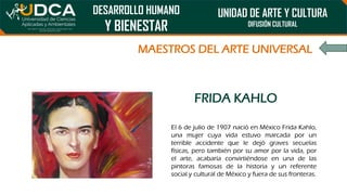 Frida Kahlo, nacida el 6 de julio de 1907 en México, se convirtió en una destacada pintora y figura cultural a pesar de enfrentar secuelas graves de un accidente de tráfico y múltiples operaciones. Su obra refleja la dicotomía entre sus deseos y su dolor, influenciada por el nacionalismo y su vida personal, incluida su tumultuosa relación con el muralista Diego Rivera. Falleció el 13 de julio de 1954, dejando un legado artístico que simboliza la resistencia y la identidad mexicana.