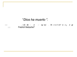El documento resume las ideas de Friedrich Nietzsche sobre la muerte de Dios y la introducción del concepto de Übermensch. Nietzsche declaró que "Dios ha muerto" y que esto representa un nuevo desafío intelectual para la cultura europea. Propuso al Übermensch como el sentido de la tierra, un ser humano capaz de crear sus propios valores basados en la voluntad de poder. Con la muerte de Dios judeocristiano, la humanidad debe destruir los antiguos valores y reemplazarlos con los del Übermensch.