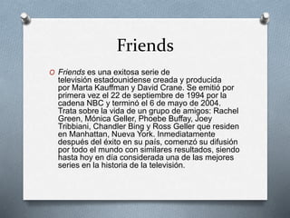 Friends fue una exitosa serie de comedia estadounidense que se transmitió de 1994 a 2004 sobre la vida de seis amigos que viven en Manhattan. La serie sigue las vidas de Rachel, Mónica, Phoebe, Joey, Chandler y Ross a lo largo de diez temporadas. Friends es considerada una de las mejores series de televisión de la historia.
