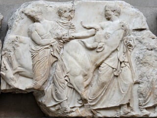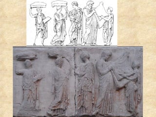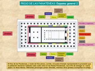 El Friso de las Panateneas representa la procesión que se realizaba cada cuatro años en Atenas para entregar un nuevo peplo a la diosa Atenea. En el lado oeste se muestran jinetes preparándose, mientras que en los lados norte y sur portadores llevan ofrendas. En el lado este, doncellas, magistrados y héroes se acercan al lugar sagrado, donde se representa la entrega del peplo en la escena central. El friso, tallado en mármol por Fidias en el siglo V a.