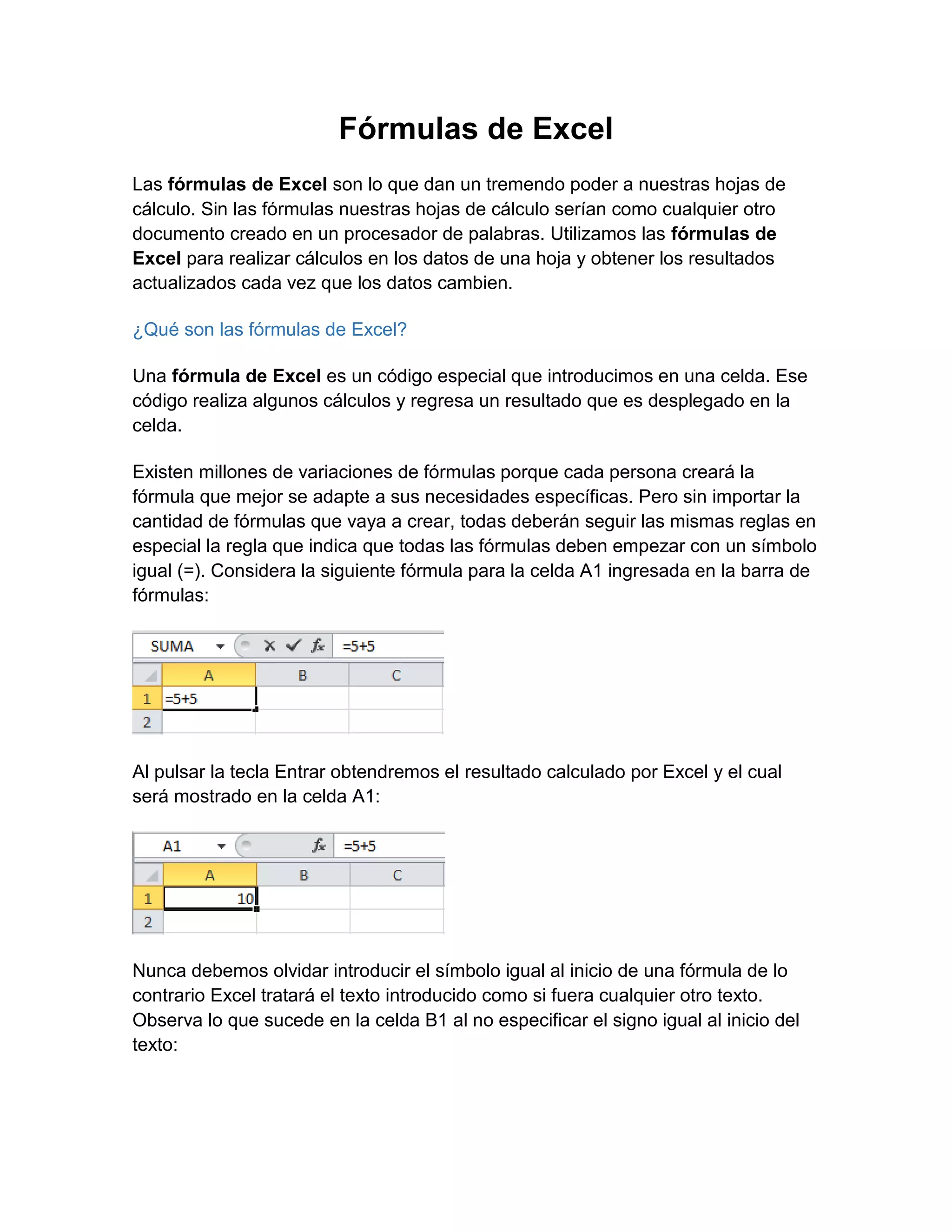 Las fórmulas de Excel permiten realizar cálculos con los datos en una hoja de cálculo y actualizar los resultados automáticamente cuando cambian los datos. Las fórmulas contienen referencias a celdas, operadores matemáticos, funciones y constantes. Al usar referencias a celdas en lugar de constantes, los resultados de las fórmulas pueden actualizarse dinámicamente cuando cambian los valores en otras celdas.