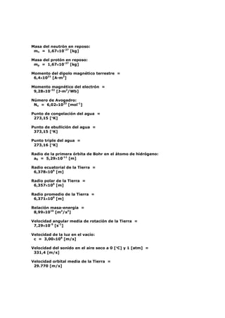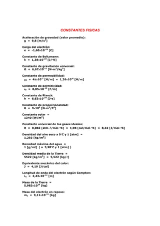 Este documento lista las constantes físicas fundamentales como la aceleración de la gravedad, la carga del electrón, la constante de Boltzmann y la constante de gravitación universal, así como propiedades físicas de la Tierra, el agua y otros cuerpos como la masa de la Tierra, la velocidad de la luz y el punto de ebullición del agua.