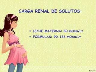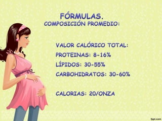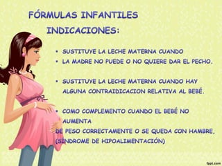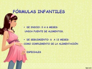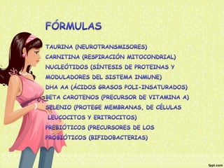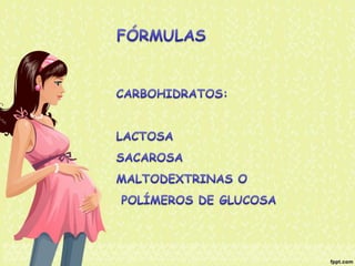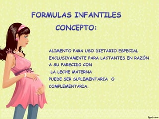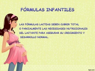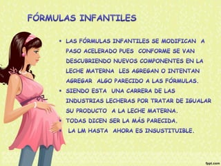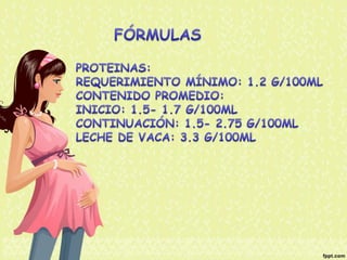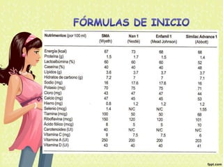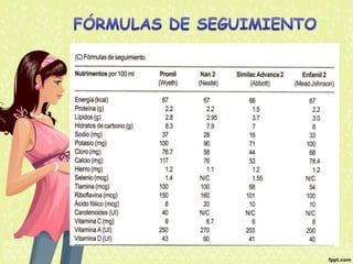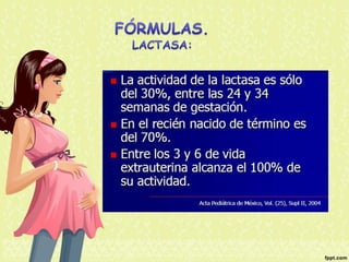 El documento proporciona información nutricional sobre fórmulas para lactantes y analiza las molestias gastrointestinales leves comunes en ellos. Explica que alrededor del 67% de los bebés cambian de fórmula a los 3 meses, principalmente a otra fórmula similar, y que los principales motivos son la inquietud, cólicos y estreñimiento. Además, describe que la inmadurez intestinal puede causar dificultades en la digestión de lactosa y proteínas en los recién nacidos.