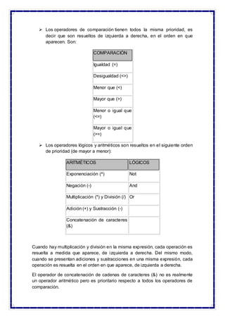 El documento describe las fórmulas en hojas de cálculo. Explica que una fórmula es una secuencia de valores, referencias a celdas, funciones u operadores que permite realizar cálculos con los datos. Detalla los diferentes tipos de operadores como aritméticos, de comparación, de referencia y de concatenación de texto que se pueden usar en las fórmulas. Además, explica el orden en que Excel ejecuta las operaciones en las fórmulas y cómo los paréntesis pueden cambiar el orden de prioridad.