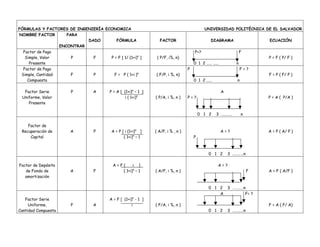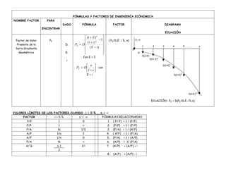 Este documento presenta varias fórmulas y factores utilizados en ingeniería económica. Define factores como el factor de pago simple, factor de serie uniforme, factor de recuperación de capital y factor de valor presente de la serie geométrica. Proporciona las fórmulas, variables y diagramas para calcular cada factor. También incluye una tabla con los valores límite de los factores cuando la tasa de interés es 0% e n tiende a infinito.
