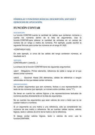 Este documento proporciona descripciones, sintaxis y ejemplos de uso de varias funciones básicas de Excel como CONTAR, SUMA, PRODUCTO, PROMEDIO y SI. Explica qué hace cada función, cómo se usa correctamente con la sintaxis adecuada y proporciona tablas con ejemplos numéricos para ilustrar los resultados.