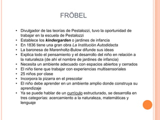 Friedrich Fröbel fue un pedagogo alemán que estableció los jardines de infancia o kindergarten. Sus principios pedagógicos se centraban en que los niños aprendieran a través del juego, la manipulación de objetos y experiencias en la naturaleza. Creó los "dones", materiales didácticos para que los niños aprendieran conceptos básicos. Fröbel también enfatizó la importancia de un ambiente adecuado, el aprendizaje individualizado y el papel de la mujer en la educación infantil