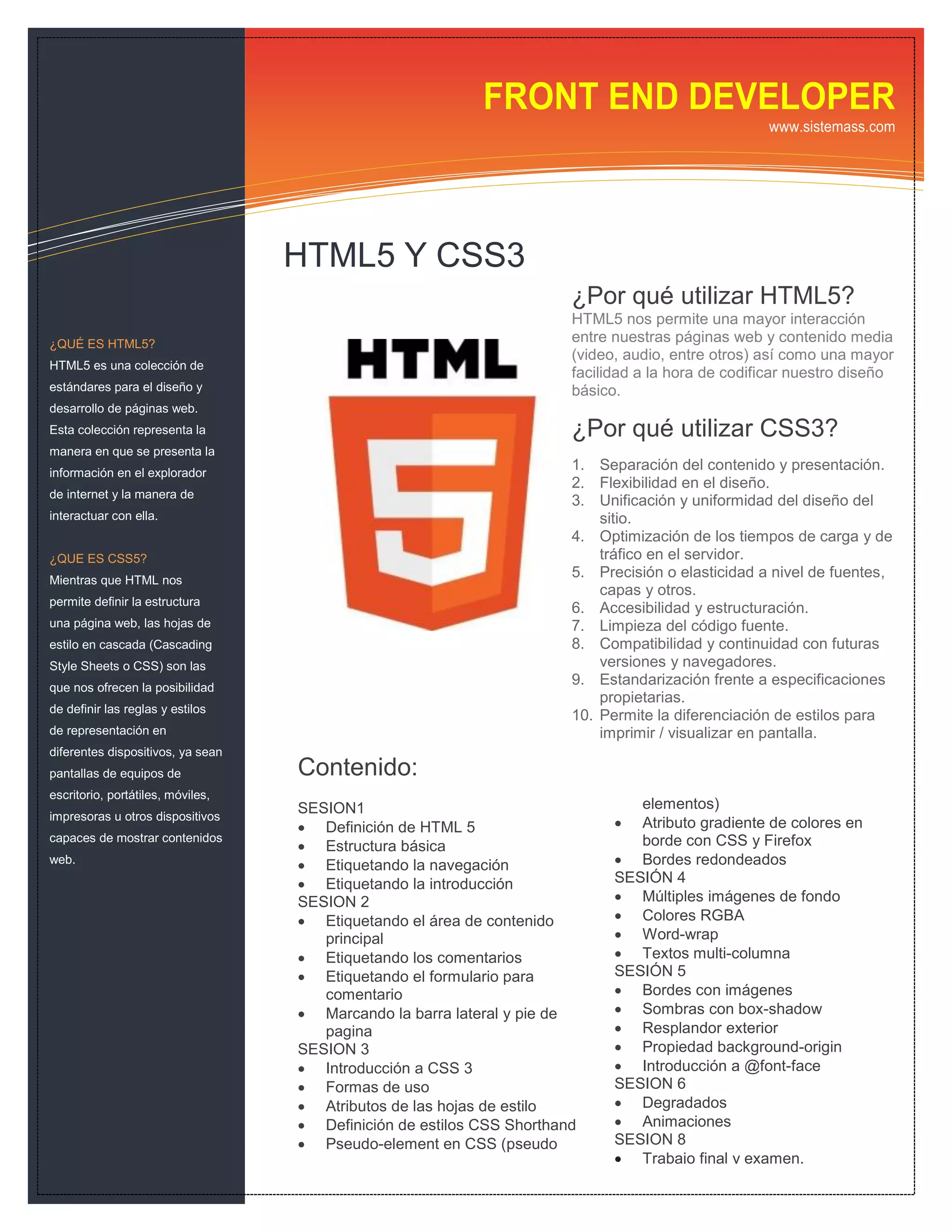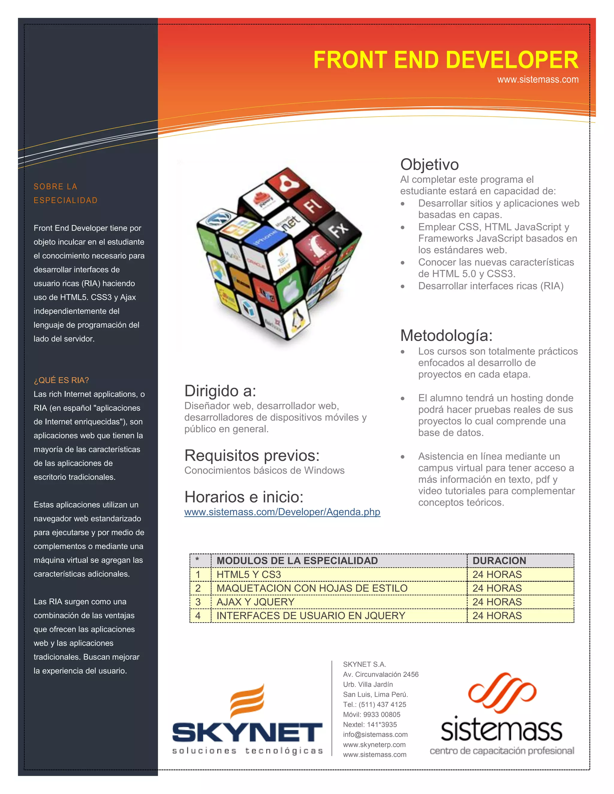 Este documento proporciona información sobre un programa de especialización en Front End Developer. El objetivo del programa es que los estudiantes aprendan a desarrollar sitios y aplicaciones web usando HTML5, CSS, JavaScript y frameworks como jQuery. El programa incluye módulos sobre maquetación, AJAX, interfaces de usuario y otros temas, y los estudiantes aprenderán de forma práctica a través de proyectos.