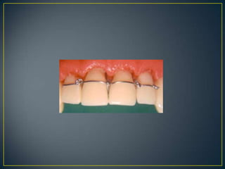 El documento describe diferentes tipos de férulas dentales, sus materiales, técnicas de confección y objetivos. Las férulas se usan para inmovilizar dientes fracturados o luxados y promover su sanación. Pueden ser rígidas, semirrígidas o blandas, y elaborarse con alambre, resina, acrílico u otros materiales. El propósito es proveer estabilidad al diente lesionado sin causar daño adicional durante la recuperación.